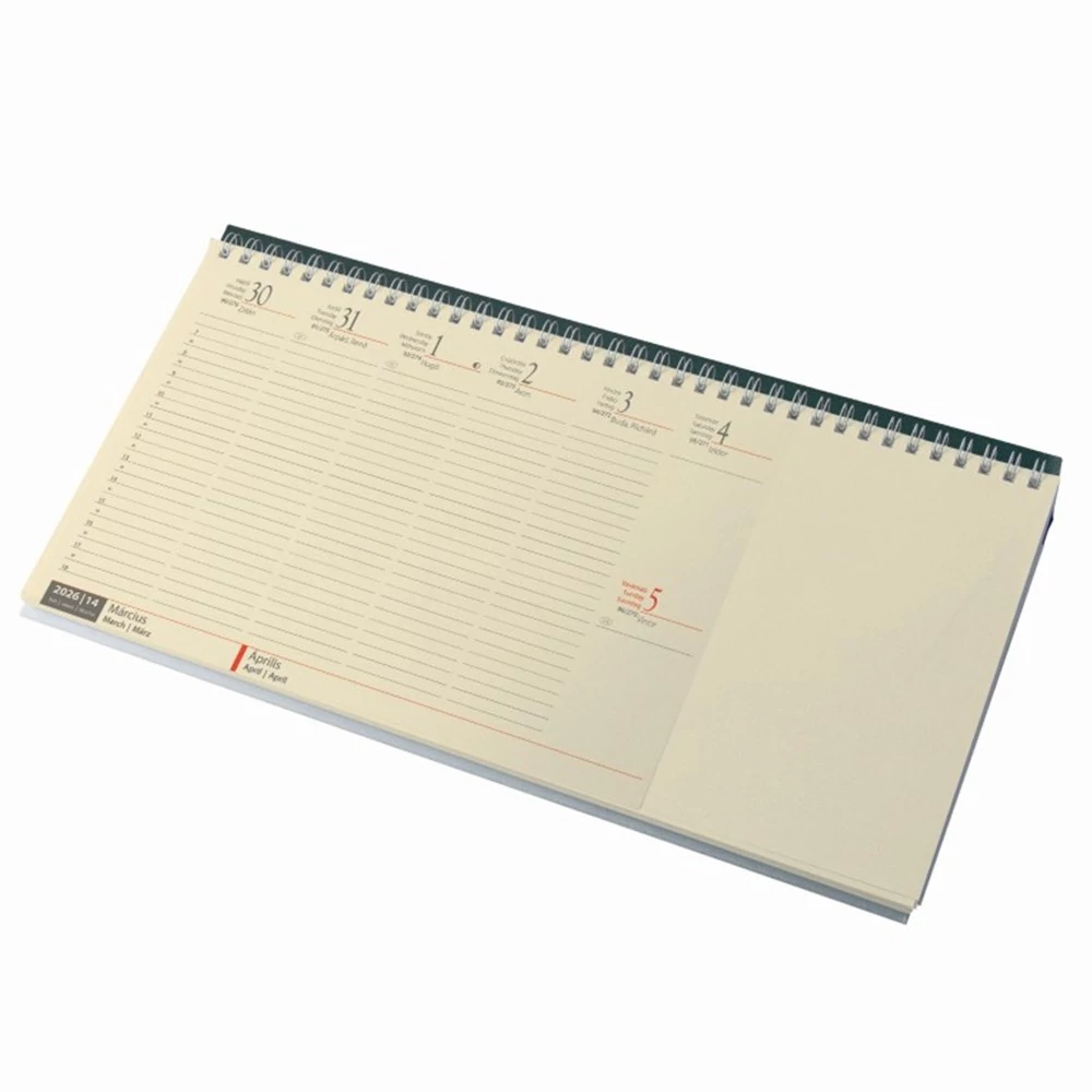 Ikerspirállal összefűzött, chamoir papíros, fekvő naptár, heti beosztással (félórás), színes műbőrrel borított tartóval.