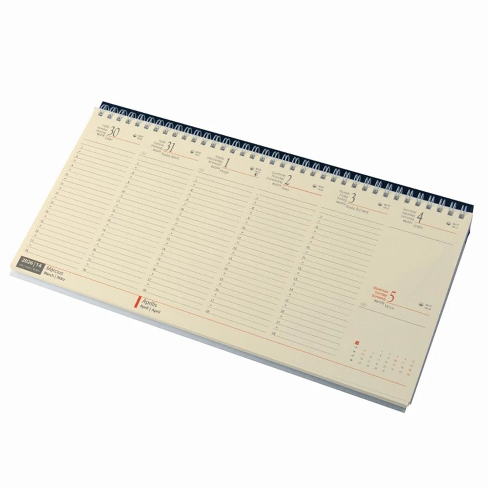 Ikerspirállal összefűzött, chamoir papíros, fekvő naptár, heti beosztással (félórás), színes műbőrrel borított tartóval.