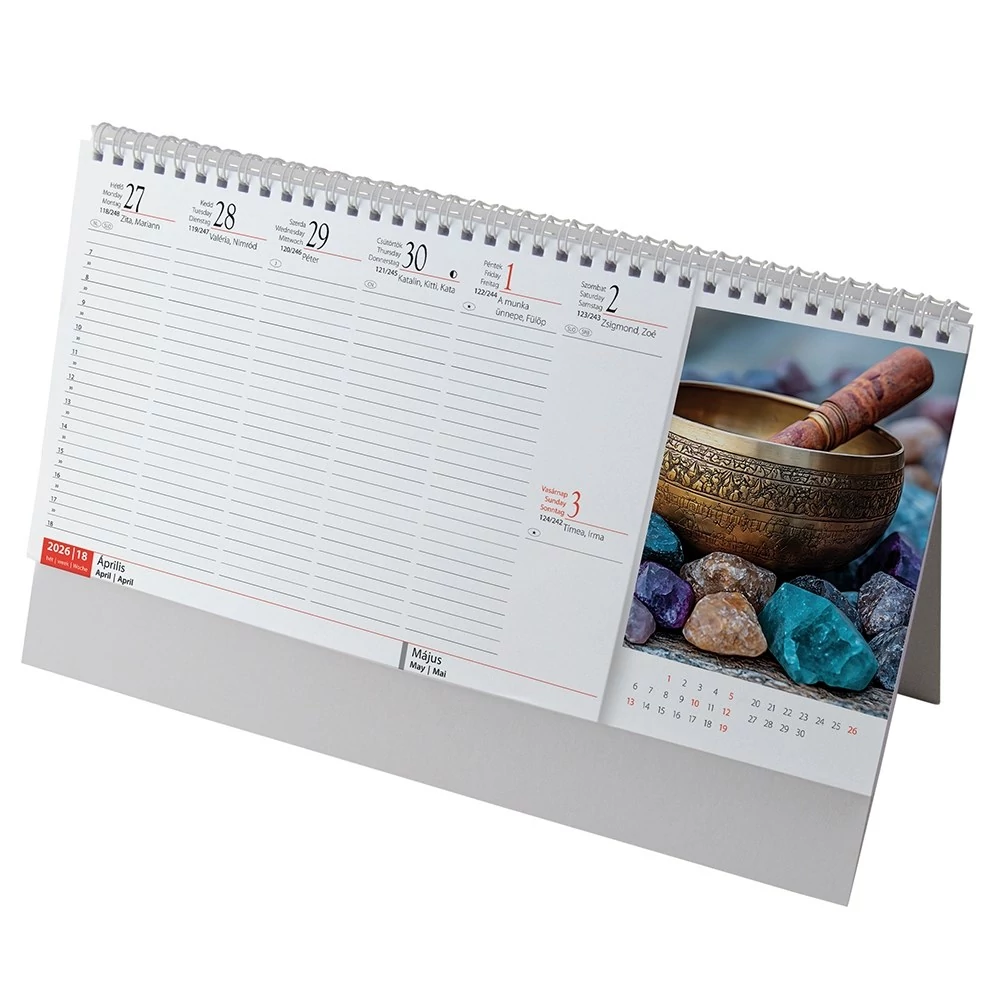 Ikerspirállal összetűzött naptár heti beosztással, 12 színes képpel, papírtáblás, álló asztali naptár. Naptárbeosztás: heti. Reklámfelület: 320x40 mm