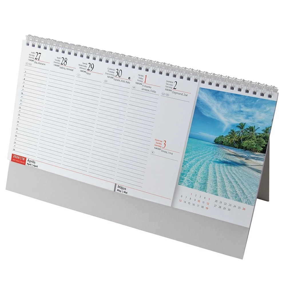 Ikerspirállal összetűzött naptár heti beosztással, 12 színes képpel, papírtáblás, álló asztali naptár. Naptárbeosztás: heti. Reklámfelület: 320x40 mm