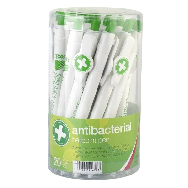 Antibakteriális golyóstoll, nyomógombos mechanikával. A műanyag alkatrészek antibakteriális védelmet adó Biomaster ezüst-ionokat tartalmaznak (biocid hatóanyag: ezüst-foszfát üveg). Az ICO Antibakteriális termékei bizonyítottan baktériumölő tulajdonsággal rendelkeznek, a felszínen megtelepedett kórokozók 24 óra leforgása alatt, 99,9% hatékonysággal elpusztulnak. Az antibakteriális hatást az angliai Industrial Microbiological Services Ltd. bevizsgálta és igazolta. Regisztrációs szám: 3264423. Vonalvastagság: 0,8 mm. Íráshossz: 2500 mm. Cserélhető betét: X-20.