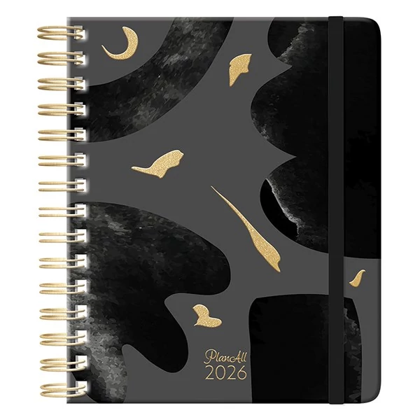 B5 méretű, spirálozott,keményfedeles, gumi rögzítős, heti tervezőnaptár.