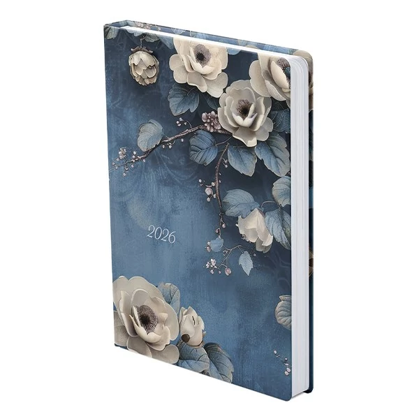 Színes grafikákkal díszített, fényes fóliával bevont, fehér tömbös napi naptár, jelzőszalaggal és sarokperforációval.