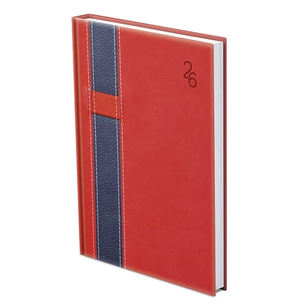 Kétféle, matt, bőrhatású és eltérő felületű, hőre színeződő műbőr bevonóval, varrással díszitett, gumis tolltartóval ellátott, fehér tömbös naptár, jelzőszalaggal és sarokperforációval (kivéve zsebnaptár). Vaknyomással és lézergravírozással emblémázható.