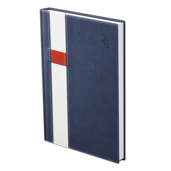 Kétféle, matt, bőrhatású és eltérő felületű, hőre színeződő műbőr bevonóval, varrással díszitett, gumis tolltartóval ellátott, fehér tömbös naptár, jelzőszalaggal és sarokperforációval (kivéve zsebnaptár). Vaknyomással és lézergravírozással emblémázható.