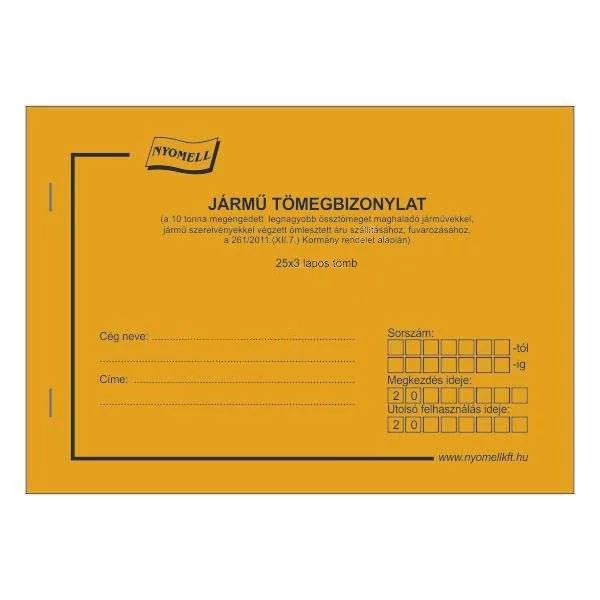 D.G. JÁRMŰ TÖMEGBIZONYLAT (10 TONNA MEGENGEDETT LEGNAGYOBB ÖSSZTÖMEGET MEGHALADÓ JÁRMŰVEKKEL...), 25x3 PÉLDÁNYOS, SORSZÁMOZOTT, A/5