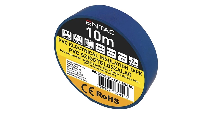 Szigetelőszalag. Mérete: 19 mm x 10 m. Kék színben.