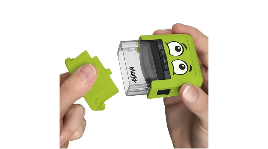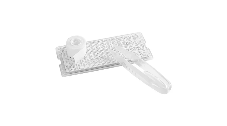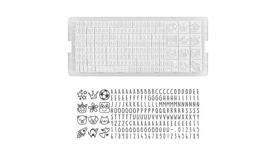 Praktikus, kirakós textil bélyegző a gyermekek ruháinak, tárgyainak megjelölésére. A betűkészletből kirakható a név, piktogramokkal színesítve.