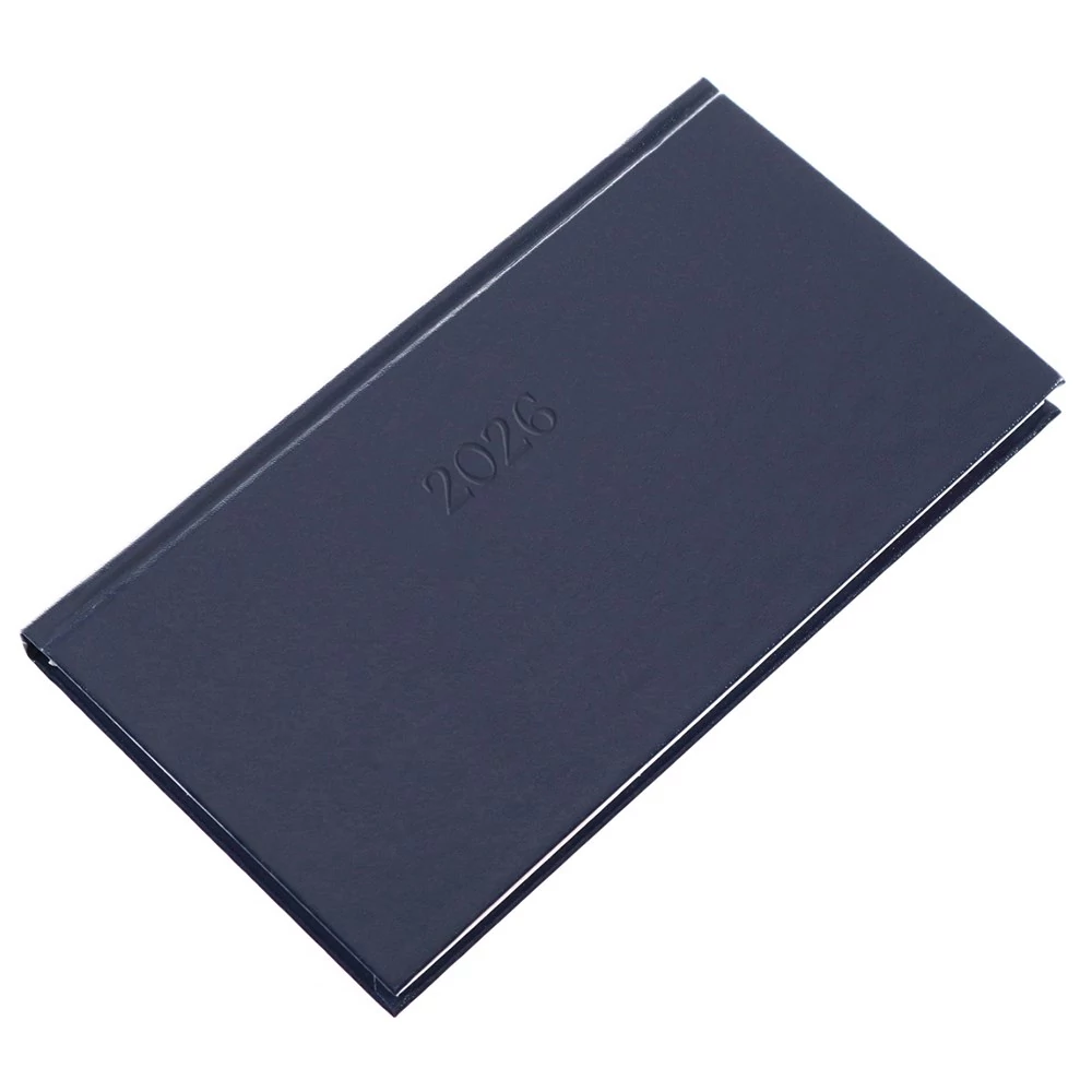 Fehér papíros, cérnafűzött, heti beosztású fekvő zsebnaptár, 144 oldalas, sarokperforált.